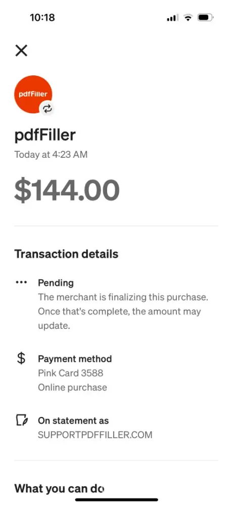 I used the service for 2 days which stipulated free seven days then charge, which I cancelled it immediately and it charged me $1.75 may 22 and it refunded me +$1.75 on may 26 because this service was cancelled now fast forward today at 4:23a.M. While I was sleeping I wake up to $144 pending to pdffiller I don’t even have the app on my phone and when I...