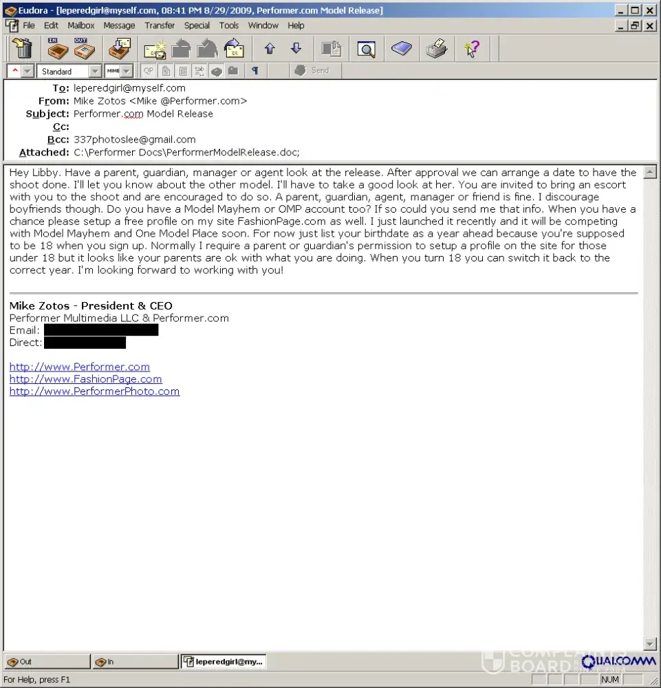 The person who wrote the preceding post is the mother of a model I managed five years ago named Libby Vilner. What she wrote is total fiction & I have written proof. The photo shoot she referred to was not only cleared by Libby's mother verbally but she SIGNED a model release on behalf of her daughter. The model release was sent to Libby via email for review by her parents or guardian 3 weeks prior to the photo shoot with an invitation for a parent, guardian or someone else to attend the shoot. I have attached a scan of the original signed release plus a copy of the original email.