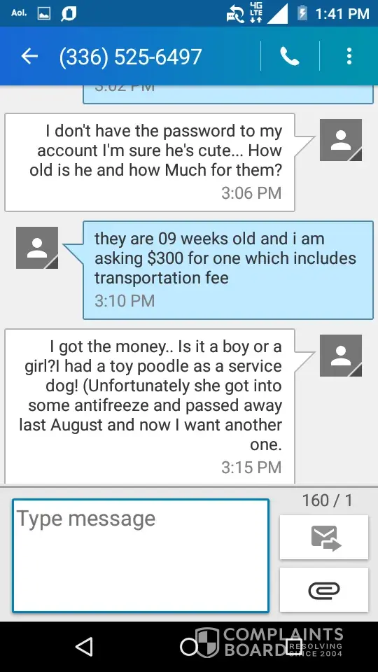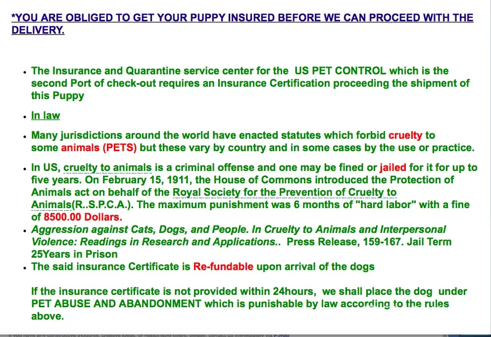 ...Also, They are saying this insurance is $650. Then because the seller (who is now harassing me and sending me concerning messages about their wellbeing) paid $250, they want me to send $400. While all this is going they are refusing to send me any of the paperwork/documentation/flight information, that has been done for this puppy.