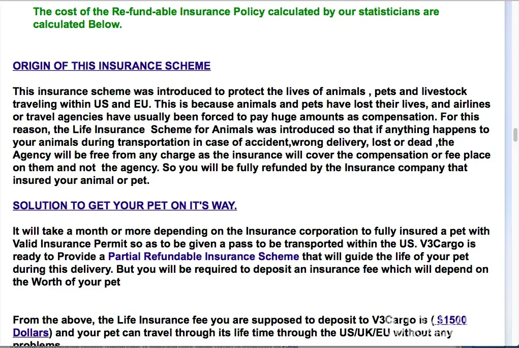 I am also being harassed by these people because I did some research before paying for a "refundable insurance" for a maltese puppy. they also claimed that all I needed to do was send money via western union or money-gram to the shipping company, a red flag came up when I searched this "refundable insurance" and now they are threatening me nonstop saying that the ministry of animal and livestock husbandry will be taking the puppy to the