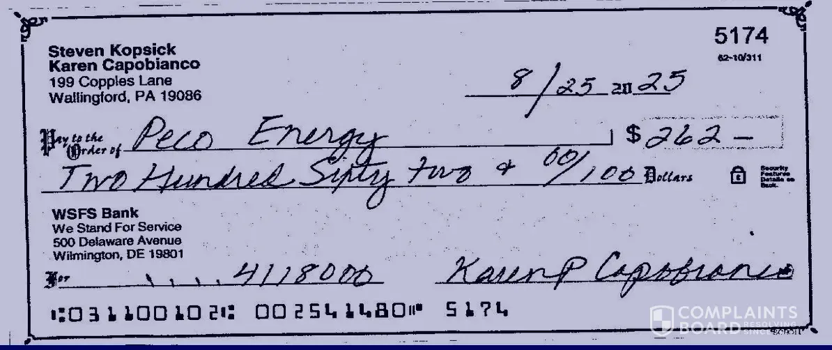 I paid my June bill.On 7/12, I noticed the check cleared for $2.62 instead of $262 and notified my bank. On 7/14, the bank agreed and debited my account payable to PECo for the balance. Peco still harrasses me to pay. After hours on the phone I sent all info to paymentservicelostpayments. still no word. My last payment was cleared for 2.62, again.
