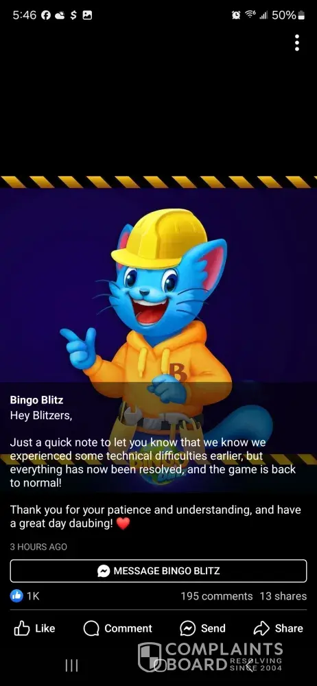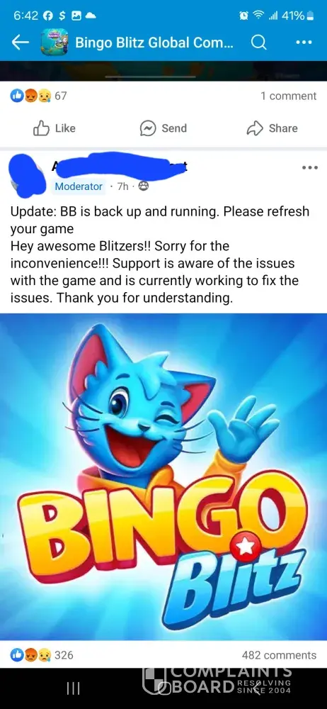 Out of all reported cases, 11 complaints (1%) have been marked as resolved, while 722 complaints (99%) remain unresolved. The most recent resolved complaint, Banning payments to bingo blitz ignored, provides additional insight into how customer issues have been handled.