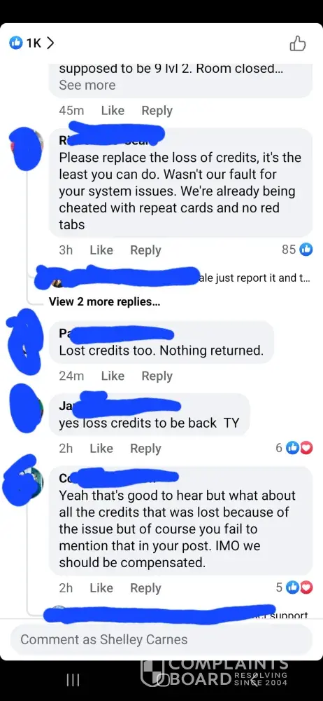 Desired outcome: Reimburse credits I would love to continue playing but changes need made in game as well customer service. look on the complaint board you see my complaint is same as the others players are getting tired of being ripped off.