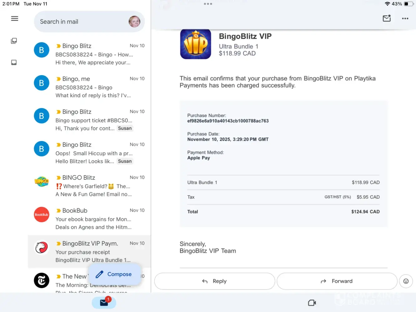 Nov 10, 2025 at approximately 8:29 MDT I discovered that Bingo Blitz on VIP PRO had posted an offer of 5965 gems for $84.99 USD. I purchased this offer using Apple Pay and played bingo for awhile. Later that afternoon I received an email from Bingo Blitz saying the offer appeared incorrectly and they were doing a system wide cancellation of these purchase...