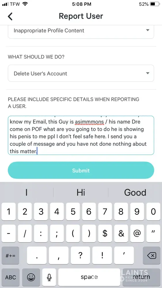 I am reporting about plenty of fish is not taking my complaint seriously about the way someone on the site is being inappropriate Exposing himself to me on this site, I warn plenty of fish But they have not done anything about this person on the site that I had blocked a couple of days ago Somehow he has come back to harass me again Once again I have sent several other message today to them where it says block user, this guy has been sending me a picture of his penis I don't feel safe on this site because they have not done anything to rectify the situation I do have pictures to show you that this guy has been exposing his self to me please help, reply to my Email [protected]@centurylink.net