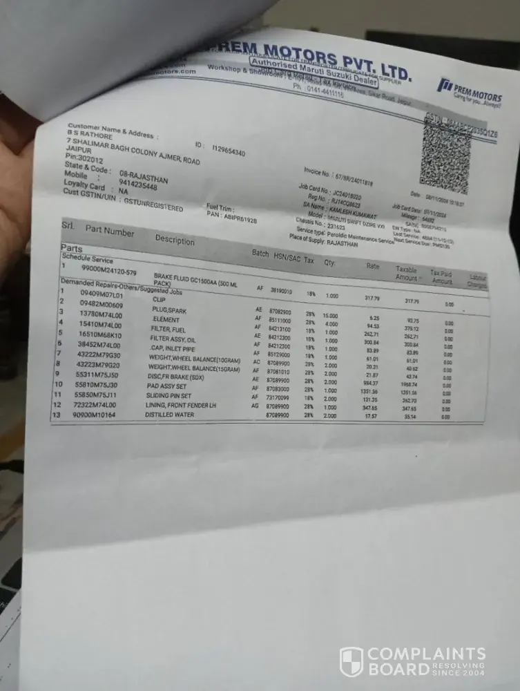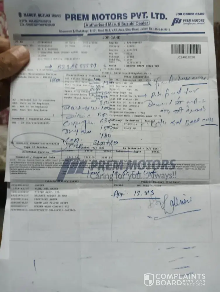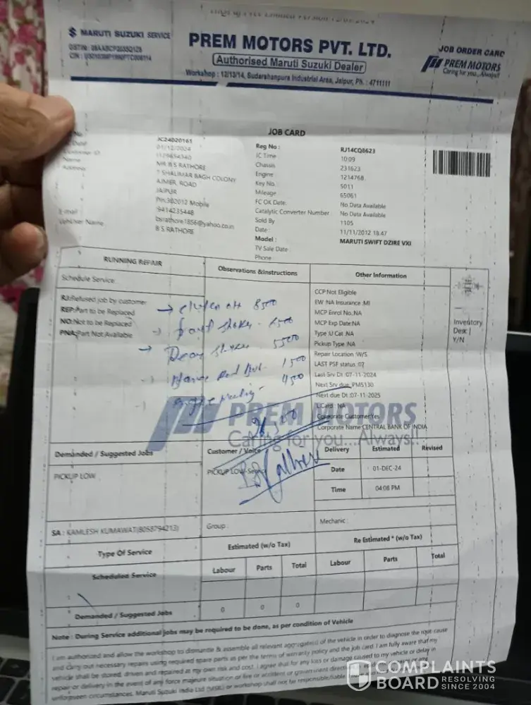 Shri prakash kumawat, 31.01.2025 general manager, prem motors, maruti suzuku ltd. Reg-car maruti dzire rj14cq8623 ref-job card no. Jc24020161 (sa-kamlesh kumawat) dear sir, with ref above I want to bring in your notice as under- 1. My car was dropped at prem motors road no 8, vkia, sikar road, jaipur for servicing on 07.112024 vide job card no...