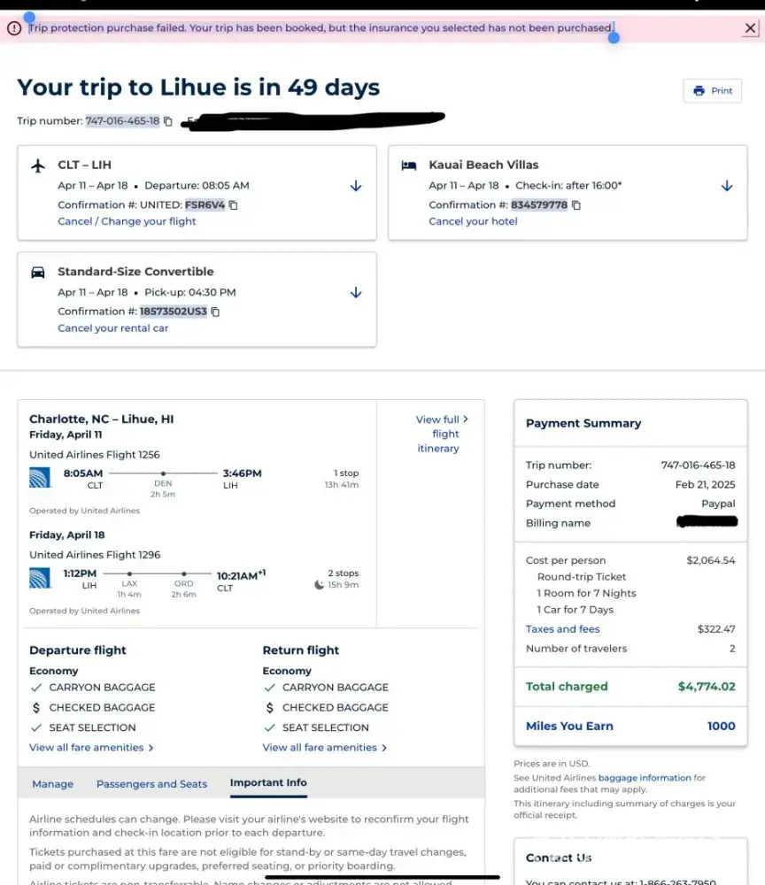 Today, 2/21/25. I used United Airlines (which is Priceline) to buy a vacation package to celebrate our 50th anniversary. After I had selected flights, hotel and car and CHECKED THE BOX for TRAVEL INSURANCE, the itinerary popped up, taking my money, confirming all the details I’d chosen and at the top of the page “ Trip protection purchase failed. Your...