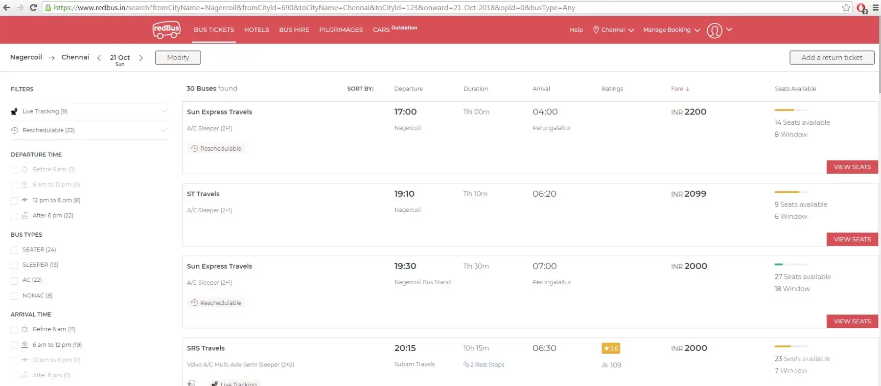 From Nagercoil to Chennai on 21-10-2018