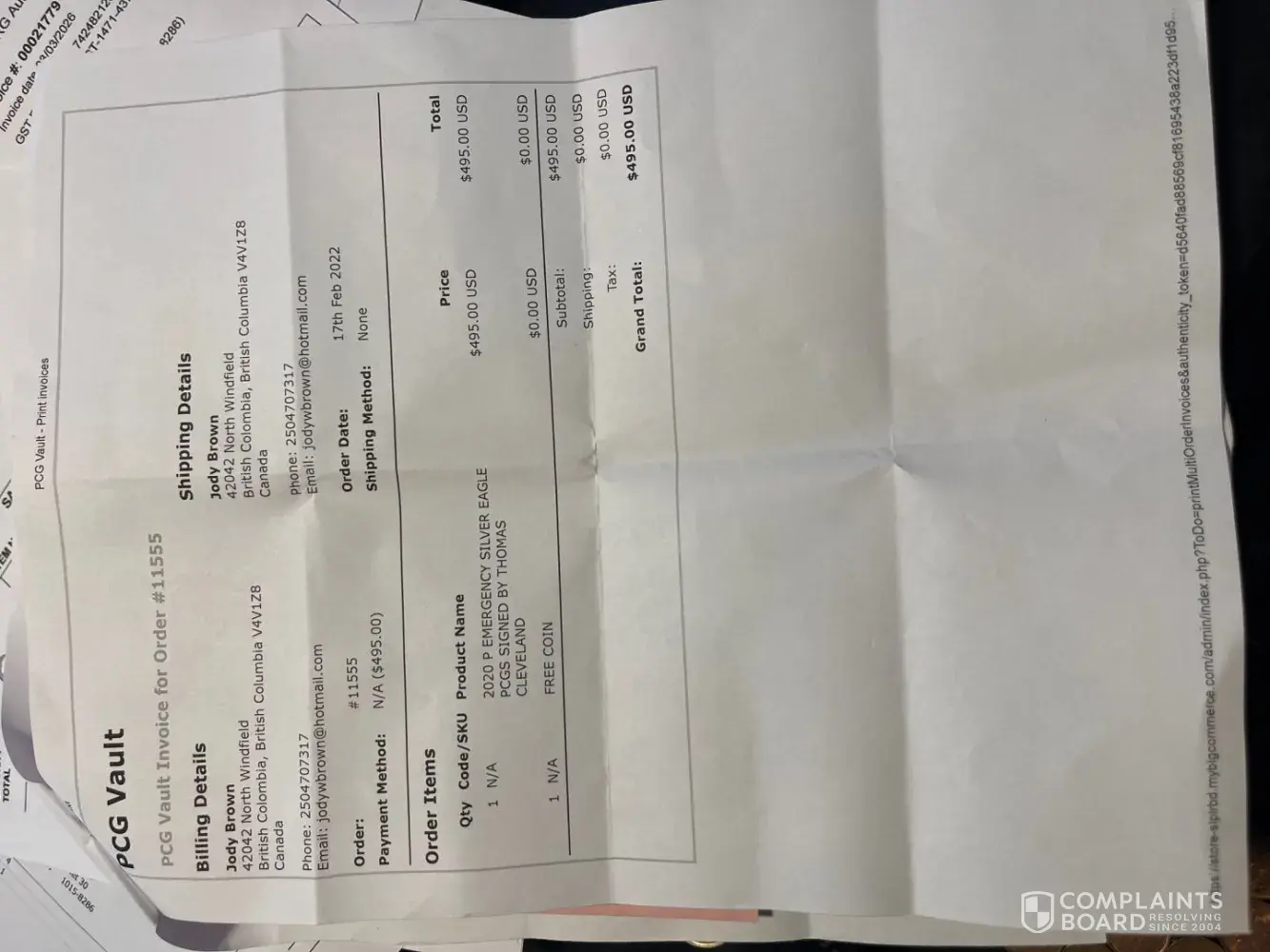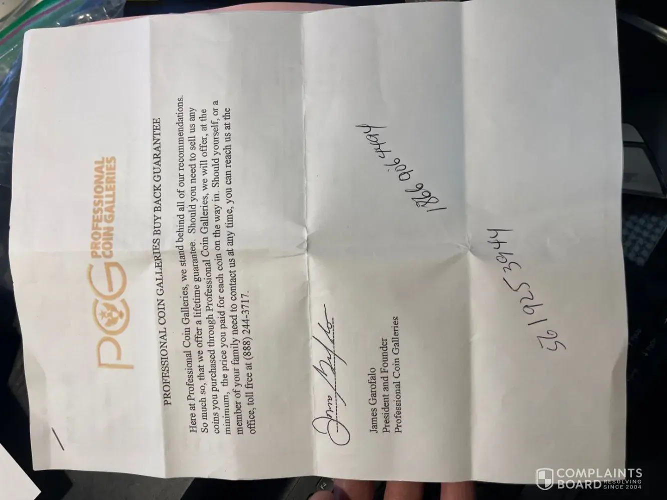 I got me some coins from Professional Coin Galleries, like a 2020 W palladium coin and 10 2020 silver eagles on Nov. 4, 2020. They told me them coins had a buy back guarantee, and the price was $12000. But now, the big boss ***, who put his name on the guarantee, ain't following through. He don't pick up when I call and don't answer my texts or emails much.
