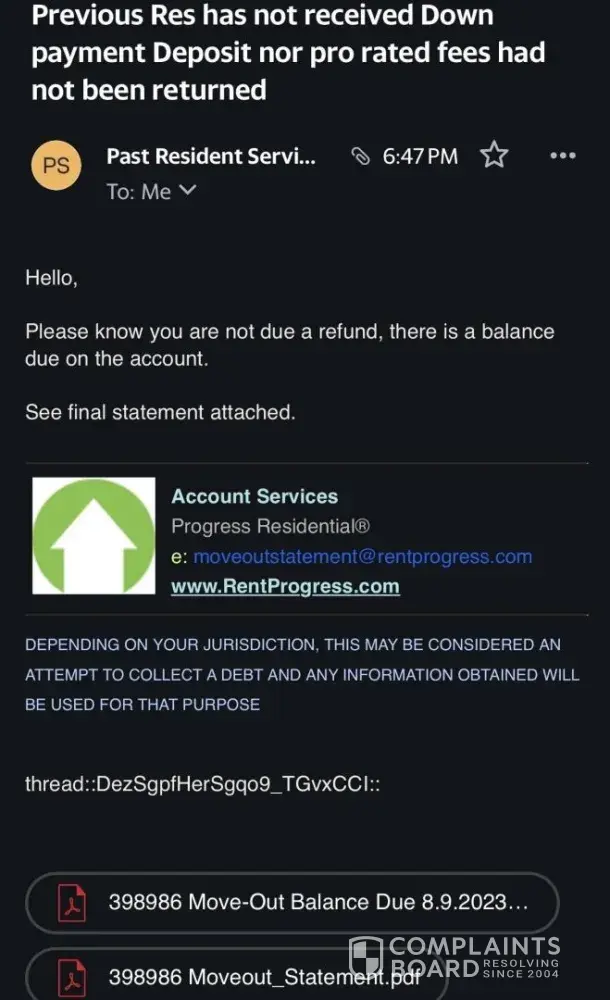 I have emailed several requests to Progress Residential in regard to my lease coming to an end and my final move out expenses being incorrect. I have duplicate line items on my final move out invoice that I have tried to have corrected or explained. I have emailed all provided email addresses from Progress Residential and the only communication I ever receive is confirmation for the customer service department via email that my case has been received and that a member would reach out soon. Its been over 4 weeks now and I have issues stacking up that more than likely could have been resolved in less than 5 minutes if I could speak with my Property Manager. There is no direct way of communicating with Progress Residential and it appears that the company policies are not accommodating to providing the needed service to their tenants. I am a victim of this company and I have several hours wasted in emailing them and writing Complaintsboard.com complaints. What is Complaintsboard.com doing about this company having over 600 complaints in our community in the last 12 months? My issues are not a one off with this company it is ongoing as over 600 other complaints have been filed with Complaintsboard.com. Someone needs to look into management as they are clearly not doing their job and should have never been in the customer service industry.