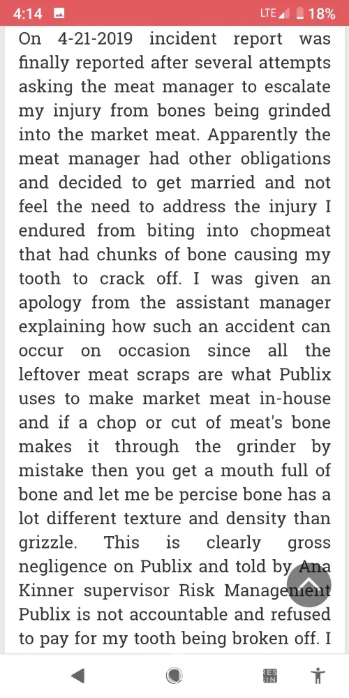 On 4-21-2019 incident report was finally reported after several attempts asking the meat manager to escalate my injury from bones being grinded into the market meat. Apparently the meat manager had other obligations and decided to get married and not feel the need to address the injury I endured from biting into chopmeat that had chunks of bone causing my tooth to crack off. I was given an apology from the assistant manager explaining how such an accident can occur on occasion since all the leftover meat scraps are what Publix uses to make market meat in-house and if a chop or cut of meat's bone makes it through the grinder by mistake then you get a mouth full of bone and let me be percise bone has a lot different texture and density than grizzle. This is clearly gross negligence on Publix and told by Ana Kinner supervisor Risk Management Publix is not accountable and refused to pay for my tooth being broken off. I was also told the bone segments I brought and left with the manager would not be given back to me which is unethical and goes against every value Publix advocates on integrity and customer satisfaction. It seems like big corporation just wants to squash the consumer and the word is called bullying. The public has the right to know the risks of purchasing meat and the truth about the fundamental core values of Publix and their hypocrisy.