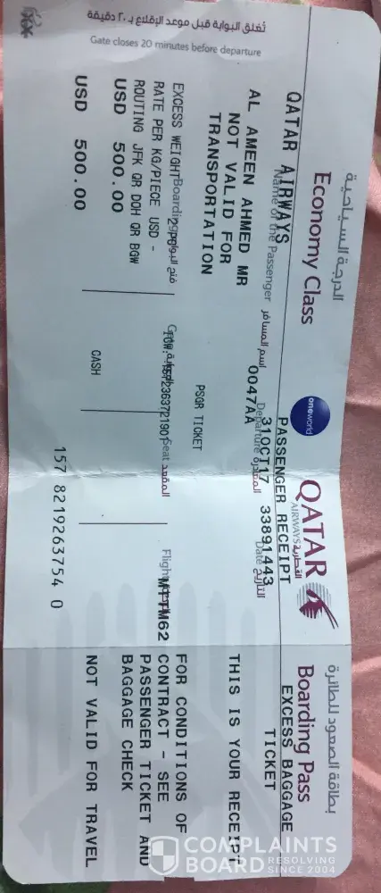 This is Mr. Ahmed AL Ameen, I had a flight from Newyork JFK to DOH and from DOH to Baghdad. The flight reference is MTTM62. Firstly, I bought two excess pieces of baggage (23 Kg) online for 400 $. However, when I was at the JFK airport, The agent said "the money was not taken from your account and you have to purchase the two pieces of baggage in cash. " So I purchased them cash and paid 500$ as shown in the attached copy of the receipt. Yesterday, I checked my online bank account and I found that you charged me for 400$ for the baggage again. So I would like you to refund me the money 400$ of the online purchasing. Thanks