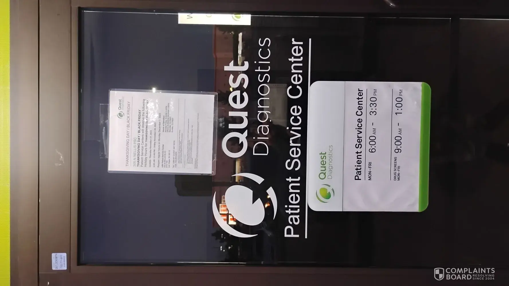 Today is 11/28/2025, I scheduled my appointment for today at 6:10am, I got up at 5:00am, went to Quest Labs down the street from where I live 5 minutes away. I arrived there at 6:00am. Lot of patients started to get out of their cars, they either were walk-ins or had an appointment like I did, they checked the doors, those were still locked, no lights were...
