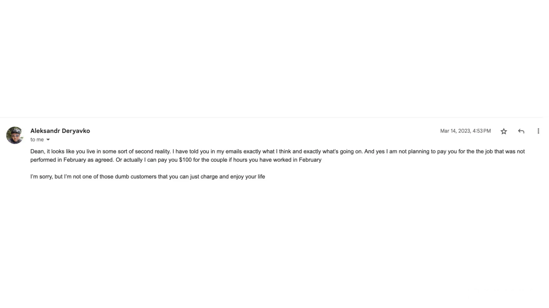 Aleksandr Deryavko hired me to help with marketing for their website. He didn't pay for the services delivered and scams his contractors. Jan 2023: Contract agreed (written) Feb 2023: First deliverables made Feb 2023: Starts making impossible demands like making investments our of my own pocket March 2023: Ignores everything delivered and says nothing ha...