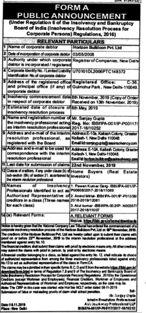 NCLT declares HORIZON BUILDCON (P) Ltd a company owned by JEEVESH SABHARWAL BANKRUPT The residents accused the builder to target mainly old, retired and ladies, The Modus Operandi they followed in luring the buyers is that they gave assured return on full payment in advance. People with no income used their savings and booked units in Orizzonte. The...