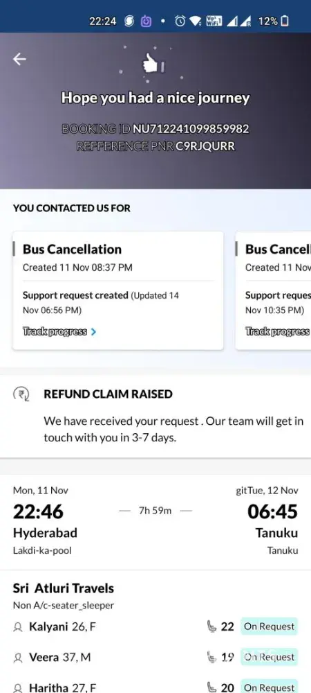 2) Then, they wait me out for 2 hours. (10pm to 12pm) with disable tracking status and switch off his mobile throughout this incident. Even your service care executive was not able to approach him you can verify this by your service care data on (25/01/2025) in between that he consistently abused me and misbehave with me and refused to give us blankets. what I thinks they tried to scam with us, they try fill passengers offline on my online booking ticket that why they waited us for 2 hrs. after my onboarding he shuffle my seats with offline passenger.