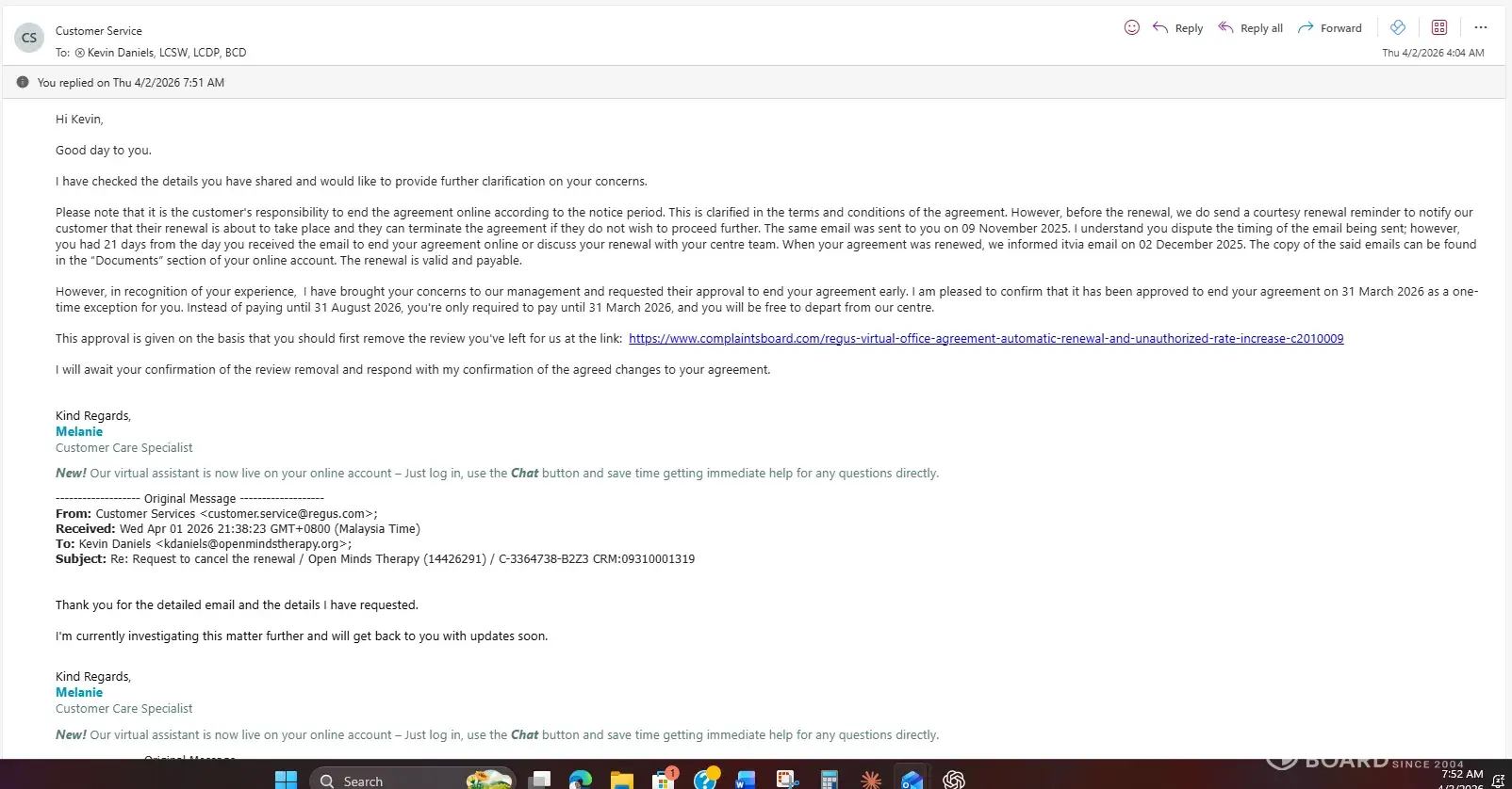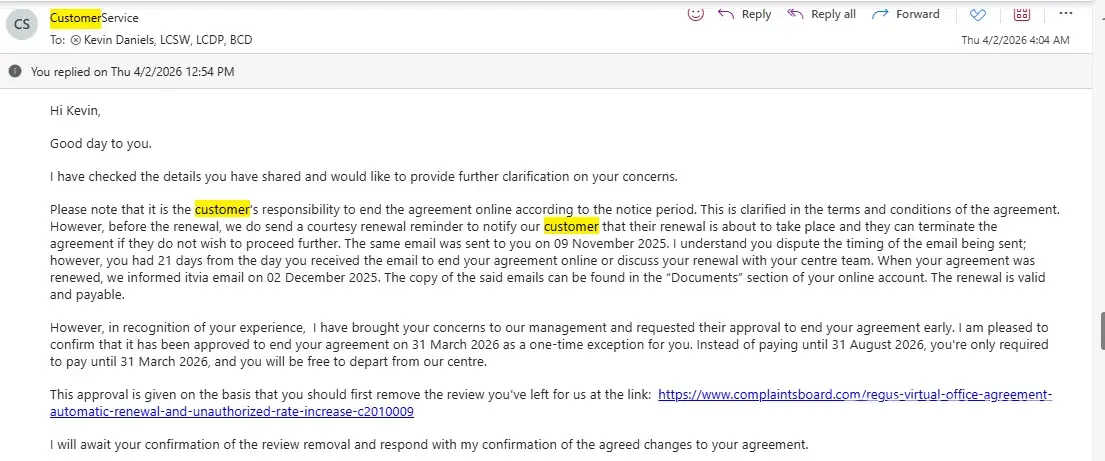 The complete sequence in my case is as follows: a courtesy reminder sent at 8:25 PM on a Sunday with a 21-day opt-out window for a renewal four months away, containing a 36.6% rate increase embedded in the body of the email, followed by a post-renewal confirmation with no exit mechanism, followed by a pattern of correspondence in which every substantive legal argument I raised was met with a restatement of Regus's contractual position rather than engagement with the argument itself.