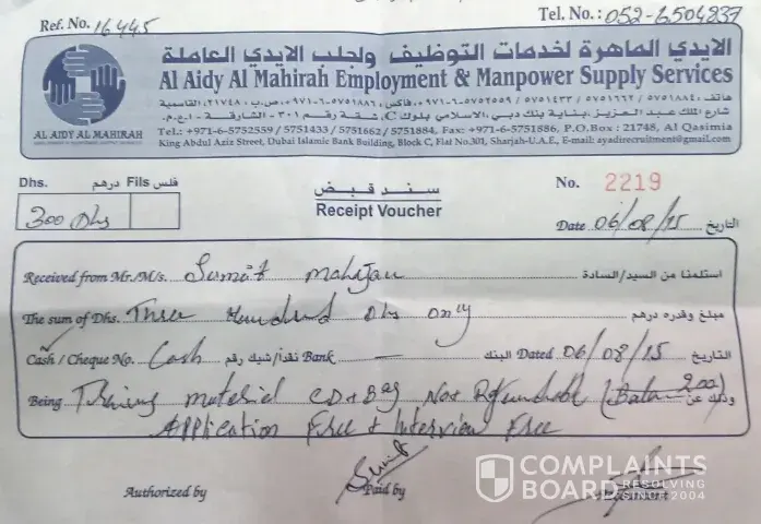 I was scammed just like everybody else. I was searching job sites and came across a post of a certian company that required staff. I applied and got contact by Al Aidy Al mahirah for an INTERVIEW. They send me their location and go there.then the so called HR calls you in for interview and shows yous attractive salary and benifits and at the end say you have to pay 210 AED for registration. I was a stupid i paid 200 AED. I regret doing so.