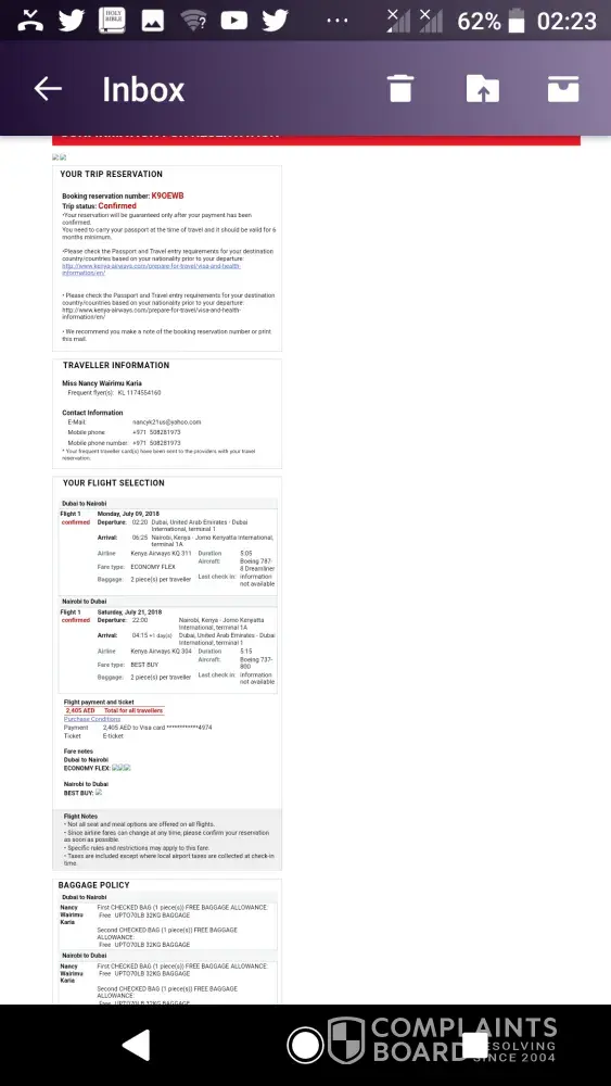 Booking reservation. I booked my ticket online and I paid for it on 7th July. It said two checked in luggage upto 32 kg. But when I arrived at the checkin counter it was so shocking that they insisted its only 23kg even after showing them my ticket they still refused and said i should complain to Kenya Airways. Since i had paid too much for that ticket and i couldn't miss my flight. I just had to repack my bags quickly and throw them extra kgs i had. Up to this moment i don't understand how that can be an errorI've always been booking tickets online. When it says 23 kg i pack the exact kilos. This time it send 32 kgand i packed 32. I am so