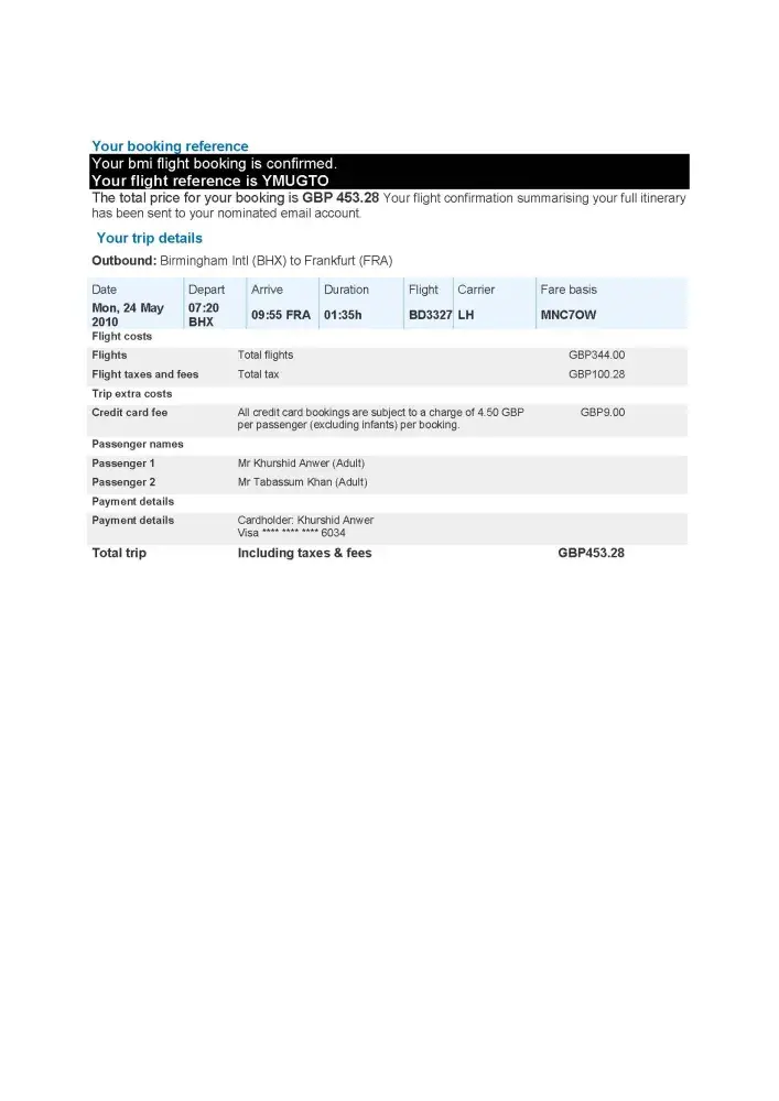 I booked flight on line with British Midland International from Birmingham to Frankfurt for 24th May for two passengers and was charged a total amount of GBP 453.28