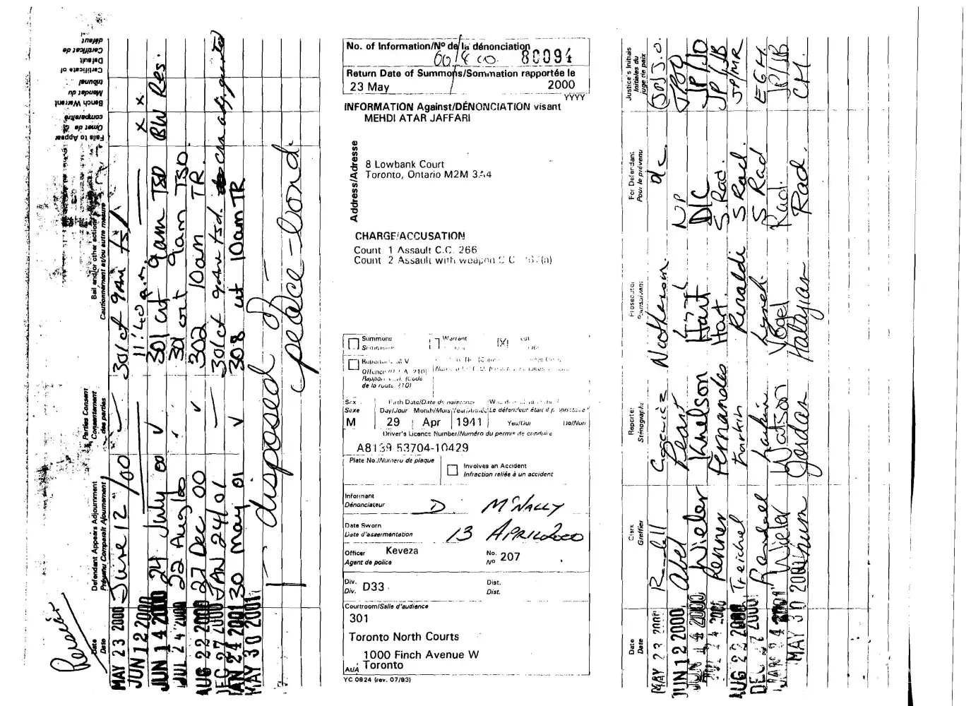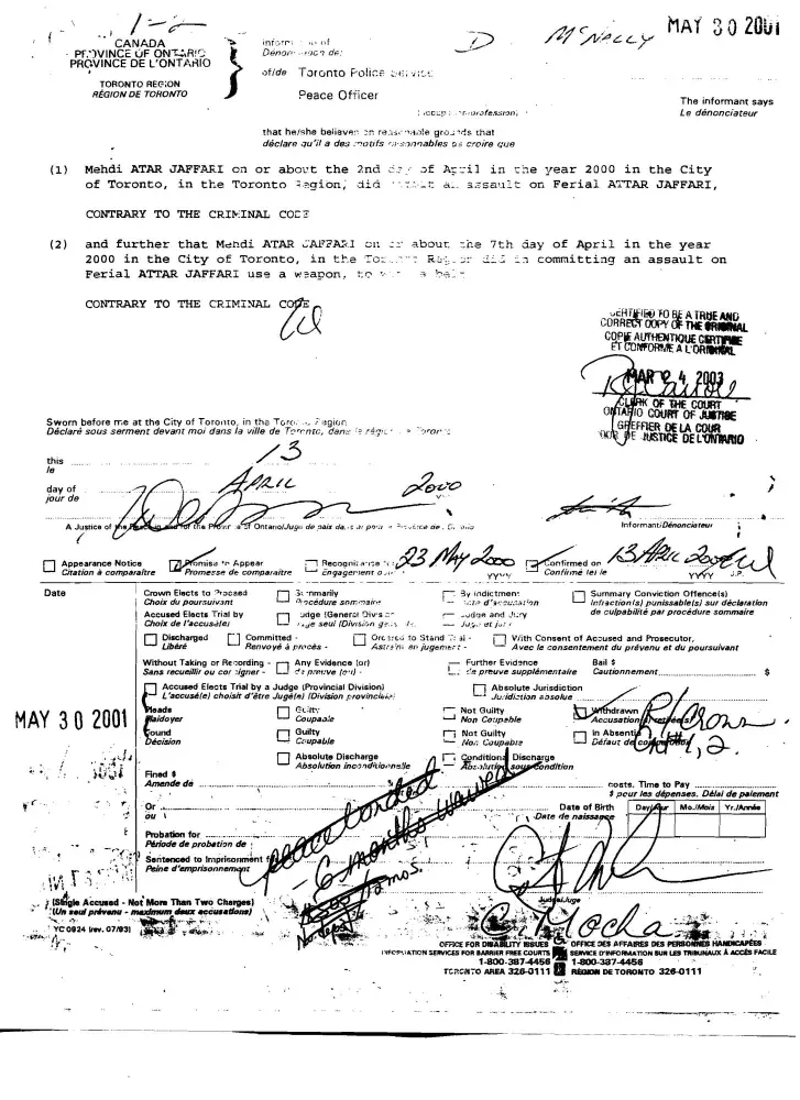 Ferial Attar Jafari, born July 12, 1981, lied to Toronto Police in April 2000 and laid false criminal charges againt her father, Mehdi Attar Jafari.