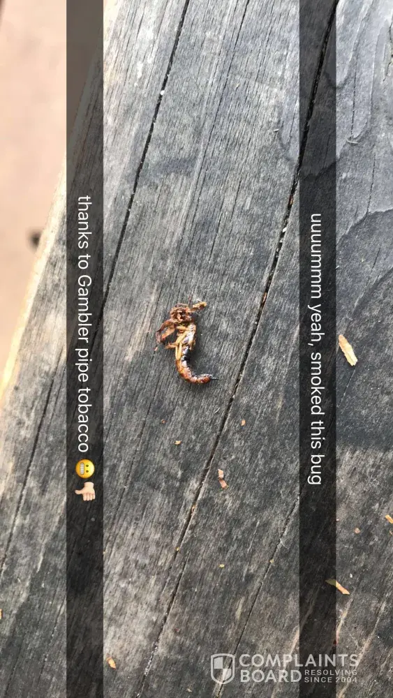 I got to smoke half of a big today thanks to Gambler Tobacco. I am very vigilant in keeping my bag sealed from the first open so I know nothing could of crawled in and it looked to be a long dead, dried up bug. It almost looked like a meal worm but it had long legs in the front and I keep reptiles so I know it wasn't a meal worm in any of its morphing stages so I'm unsure, but I have a photo I was going to send them before I realized I can't find their contact info online. The last two bags I've purchased have had a disgusting chemical like taste that doesn't allow me to finish half a cigarette anyway tho. They may be the reason I'll quit supporting the tobacco industry 😄