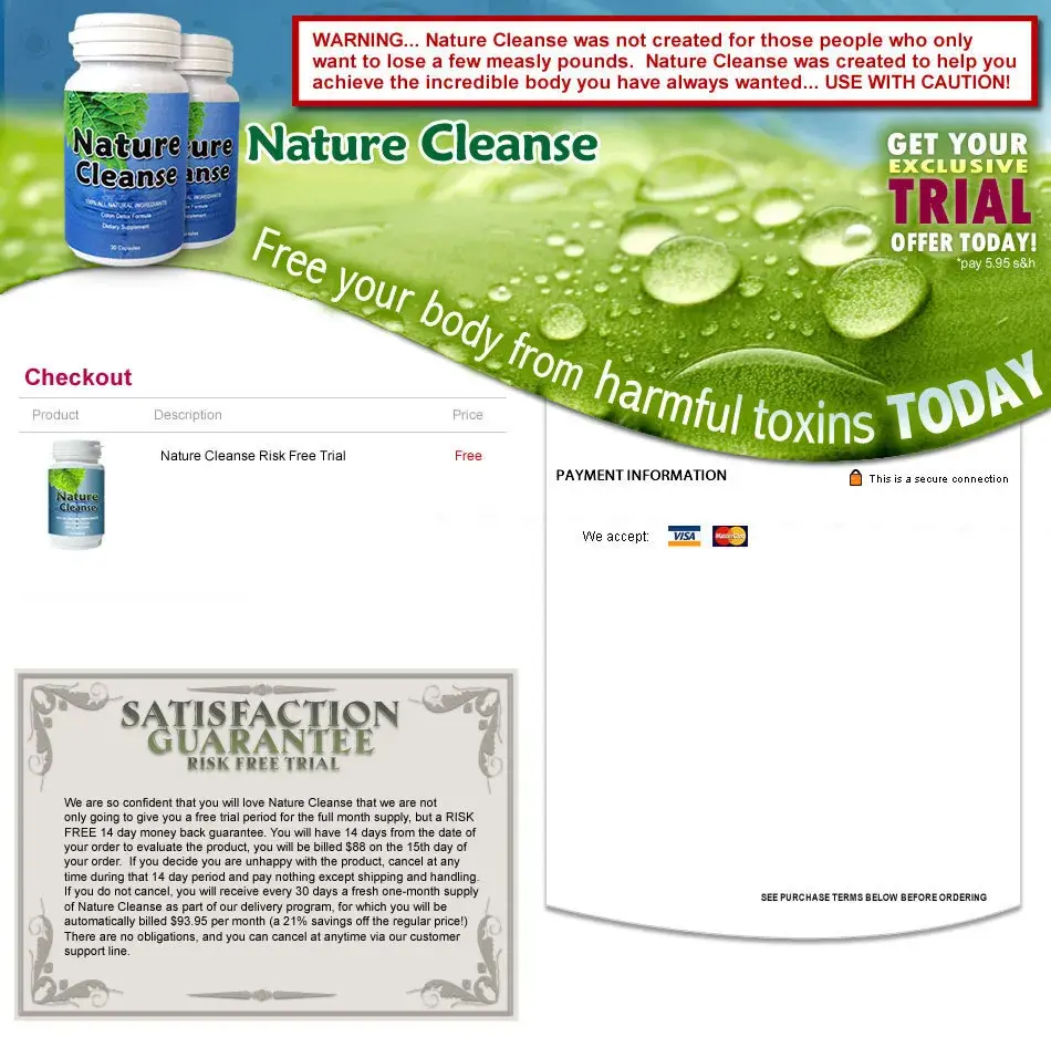 My husband ordered what was supposed to be a free trial of a supplement called "Nature Cleanse." The site boasted how beneficial the use of the product could be in regards to colon health. For only the price of shipping (5.95 i believe) a one months supply of the supplement would be sent as a trial. My husband informed me he ordered the product and when i examined my bank account i did notice the debit of 5.95 from the company for which he ordered. I had no reason to question my husbands ordering of the product assuming he knew what he was getting into. The product arrived and a week into testing i noticed a charge of $88.00 in our account. Noticing the recipient of said fee i immediately questioned my husband if he had any knowledge or possibility of such a charge when ordering "Nature Cleanse" Shocked he replied "NO!" and quickly went to the website he ordered from to gather what information i could as to how something like this could occur. Remembering vaguely seeing the site briefly when my husband told me he was ordering this product i couldn't recall seeing anything that stated such a charge. Had there been, my husband wouldn't have ordered it, nor would i have encouraged or supported him to order it. The site was just as i remembered and said nothing on the main page about any other charge other than the shipping and handling required to ship the product. Stunned i just began clicking on every link on the site i could to gather information...finally at the very bottom of the ordering page in small letters was "terms and conditions" (this link was nowhere on the main page, but only on the ordering page) clicking on that gave me all the underhanded details of this supposed "free trial" You had 14 days on which to decide if the product was right for you. if you liked the product you can do nothing and $88.00 would be charged to your card for your first months supply (so much for the bottle being free) then you continue to receive the product for a price of 88.00 per 1 month supply using the card they had on file. If you were dissatisfied, you had 14 days in which to call and cancel any future shipments. I recall when he received the pills in the mail in a bubble envelope with a small brochure describing the supplement and it's benefits. Interested i read the brochure myself with him. NOWHERE did it state one had 14 days on which to decide satisfaction/dissatisfaction of the trial, nor did it state any other charges should you not cancel within a certain time frame. it certainly didn't mention a price tag of $88.00 even if one was satisfied with the product.