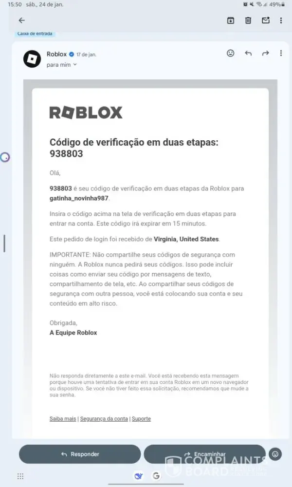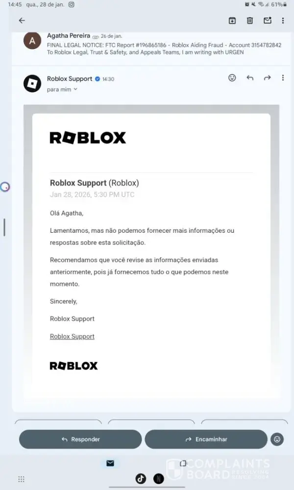 Minha conta do roblox foi invadida dias atrás, e vi q foi um hacker dos Estados Unidos q invadiu ela (nse como) . Tentei diversas vezes reclamar com o roblox, mas n tive nenhum sucesso. Já tentei de tudo! E nada ainda. A pessoa q roubou minha conta pode acabar usando ela pra fzr coisas erradas, e eu tô desesperada! O hacker tem acesso a minhas informações pessoais.. Já tentei falar isso pra empresa, mas eles basicamente n querem ajudar , acham q e tô mentindo msm com provas . Isso aconteceu uns 7 dias atrás.