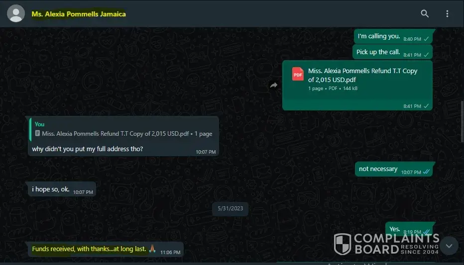 Desired outcome: I would like a refund of the USD $2000.00 that has been paid to the company