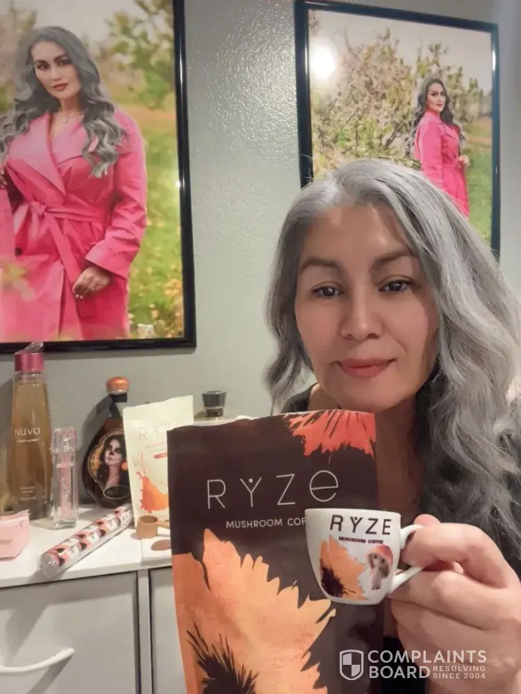 "Ever since I started drinking the Ryze Mushroom coffee, I've fallen in love! My stomach doesn't hurt anymore. I love the taste, the natural ingredients, and actually miss it when I can't have it. Ryze works with my schedule and if I need more or less, they are just an email away to help me with my subscription. I've told at last 5 friends about it and they are drinking in now including my Dad and step mom across the country. My dad is fighting cancer and had stopped drinking coffee, but now he's drinking Ryze Mushroom coffee and likes it. Thank you Ryze and keep up the good work!"