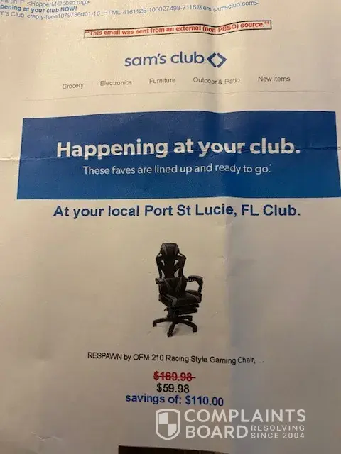 's Club ad online to my email address on [protected] telling me the deals going on at my local club, I looked to see if the product they had marked down a Respawn gaming chair marked down from $169.98 to $59.98 was available online or for delivery, but it was not only at the club for availability. I called the club on 6-26-22 around 2:30 pm on US1 in Port Saint Lucie to verify if they had any available which they advised yes 16 of them. I drove to the club around 3:00pm with the printed ad in hand only to be told by the Manager working they could not honor that price. I asked why not it is their ad and she replied" the ad is sent by a third party, and she could get in trouble for giving it to me for that price" I don't understand all their BS but I wasn't going to argue with her, I'm over a 20 year loyal customer with them. They had the gaming chair marked down at their club for $99.98 ,but would not honor the ad of $59.98. Not right!