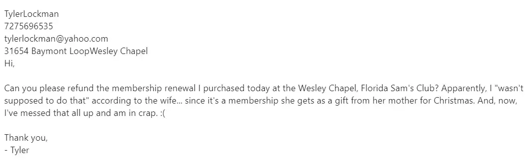 Desired outcome: I'm not sure how to rectify this. I've been a sam's club member for over 20 years....I chose sams over costco, but I may change my mind.