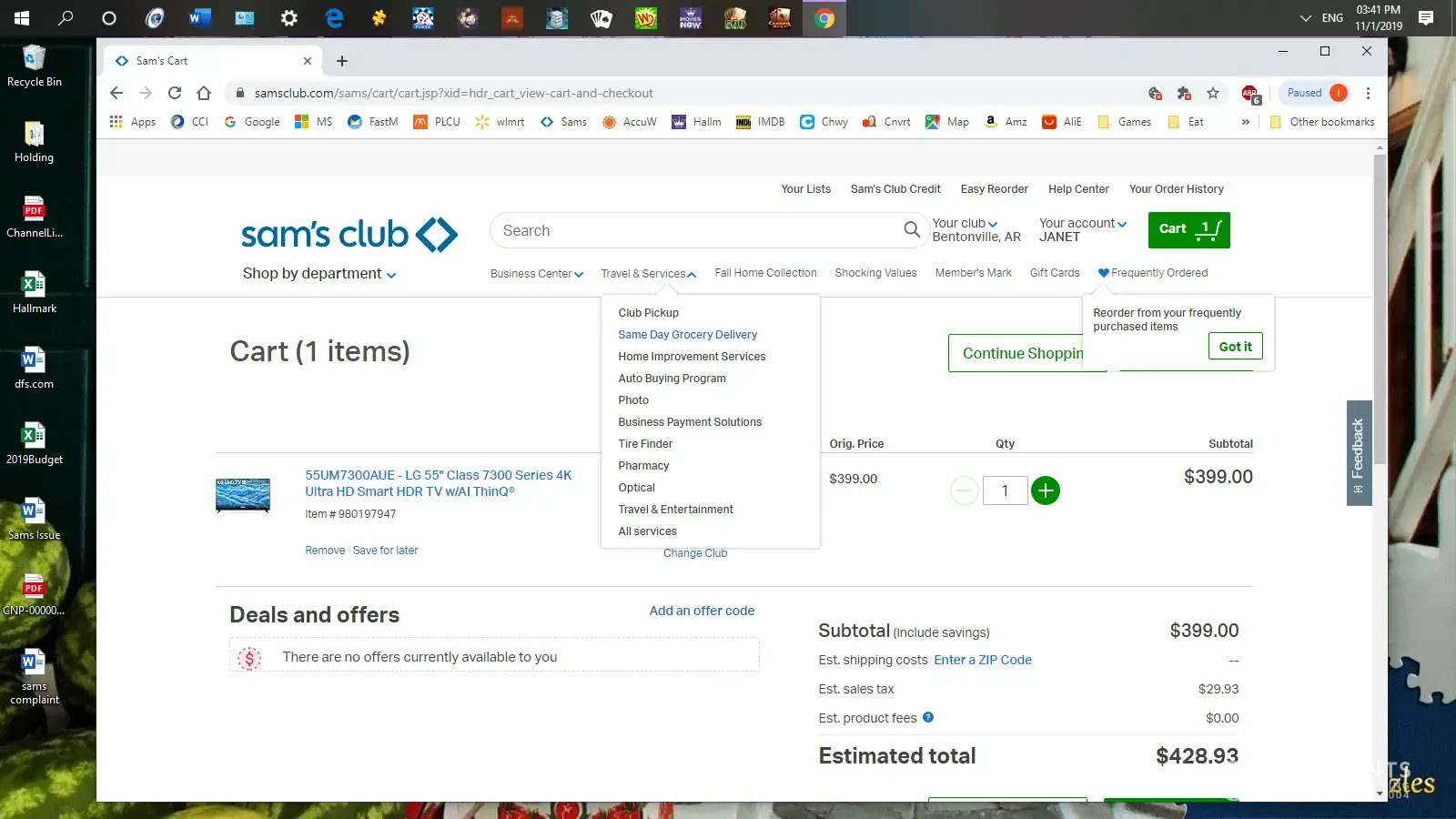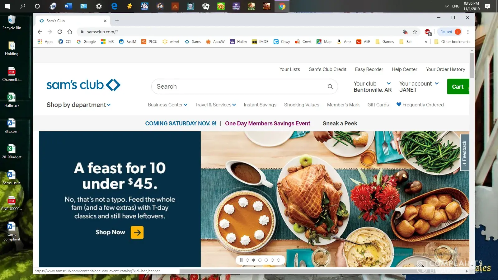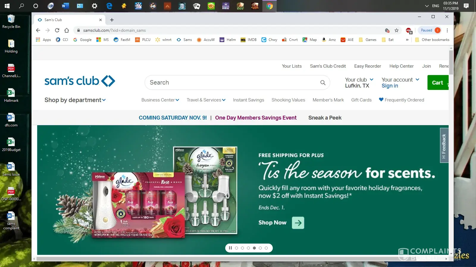I am enclosing screen shots of the issues I have addressed. One thing that you will see in the screenshots is that before I log into Sams, my location shows as Lufkin, Tx because I regularly log in and that much is saved even though I still have to give my username and password.