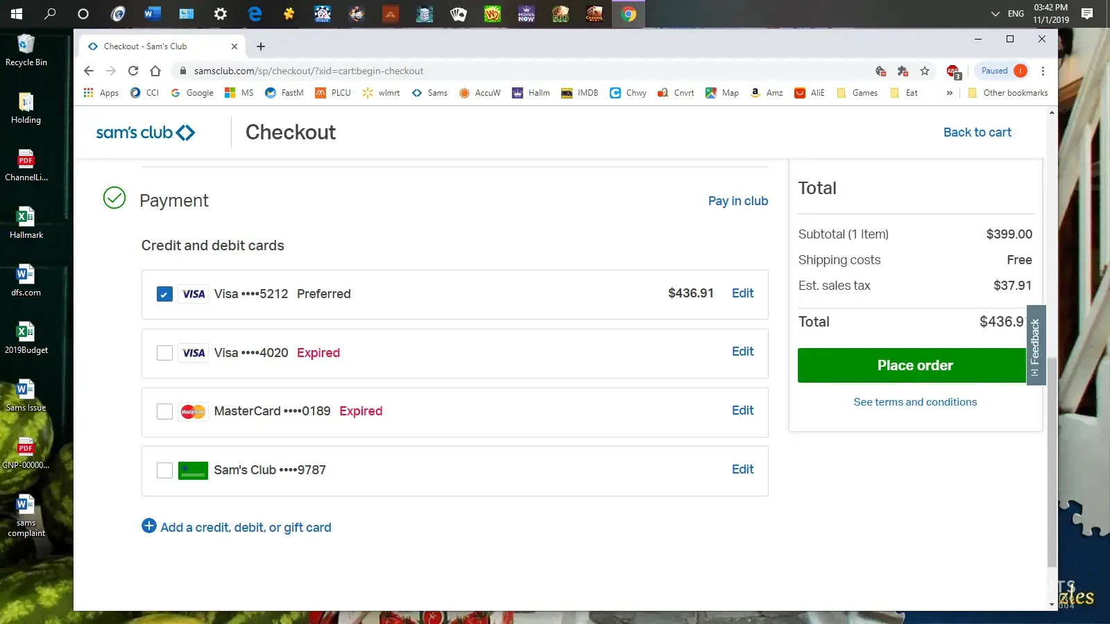 1) I do a "click-and-pull" order monthly. I create the order before my monthly check comes in so I can pick up the order as soon as my check deposits. I want the ability to "pay in store" however that is not an option. In order to make it an option I have to "game the system" by choosing one of my credit/debit cards that will be rejected. At that time I get a message saying my card was rejected and one option given then is "pay in store". I believe that the option to pay in store should always be available. Also please note that when changing the payment source the first one remains checked effectively splitting a payment. If people do not notice that they may be unhappy later.