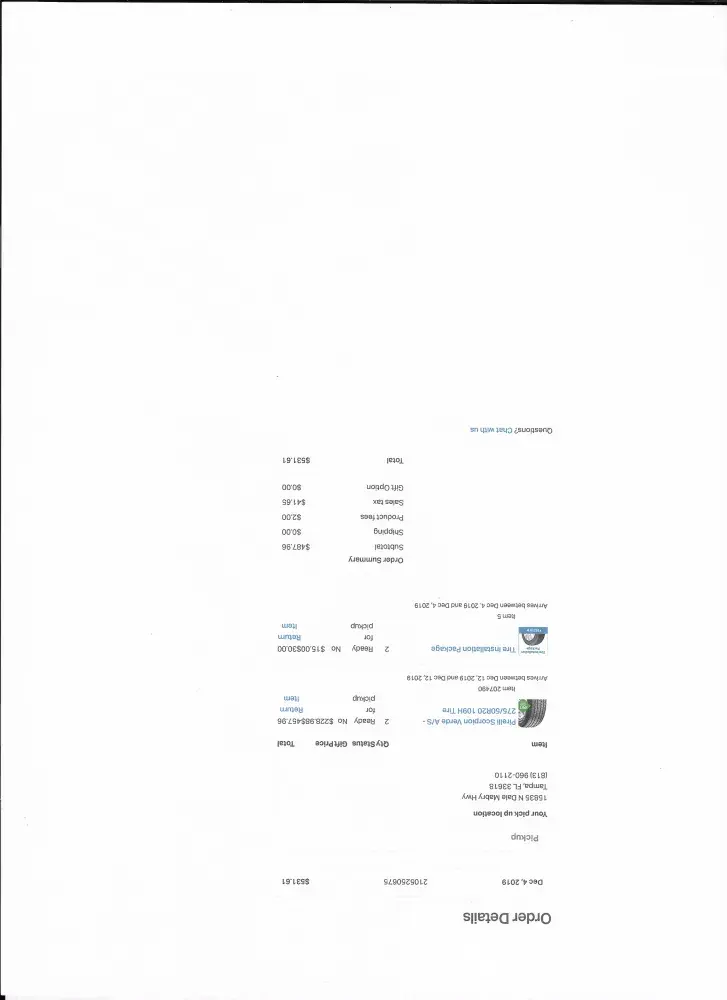 I ordered tires online Nov. 9, 2019, tires was suppose to arrive in 3 to 4 days.I did not receive a E- Mail until 2 weeks later. Went and made an appointment to have tires installed. Appointment was for Dec. 9, 2019.When I got there for the installation appointment at first they could not find the tires, after about 30 min. they found 3 of the 4 tires. They...