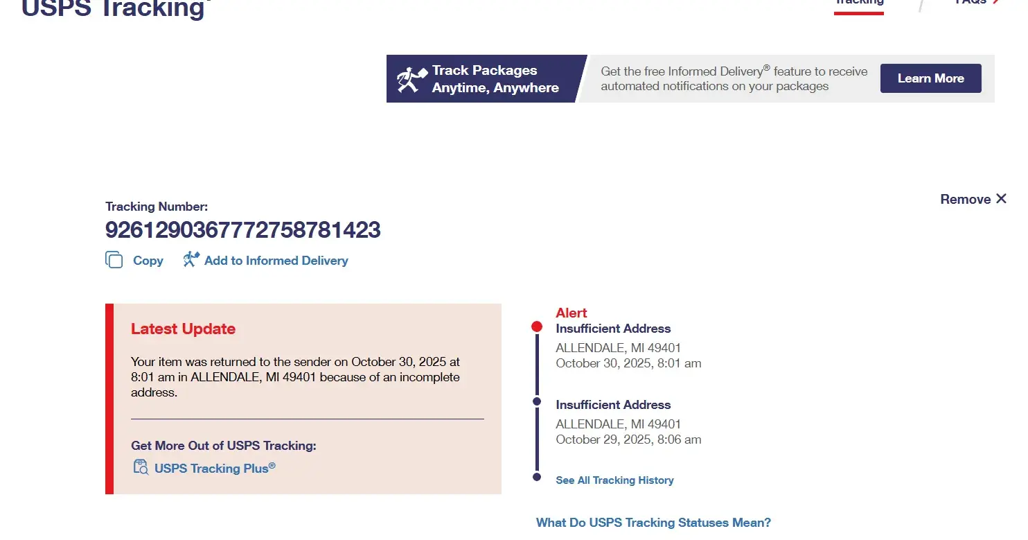 I ordered 7 items online on October 18th, with an expected delivery of October 30th. One item was delivered early, when I checked the arrival of the remaining 6 items on the expected arrival date, it showed that the package had an "insufficient address" and was "returned to sender." The tracking number for the package is 420494019261290367772758781423 on...