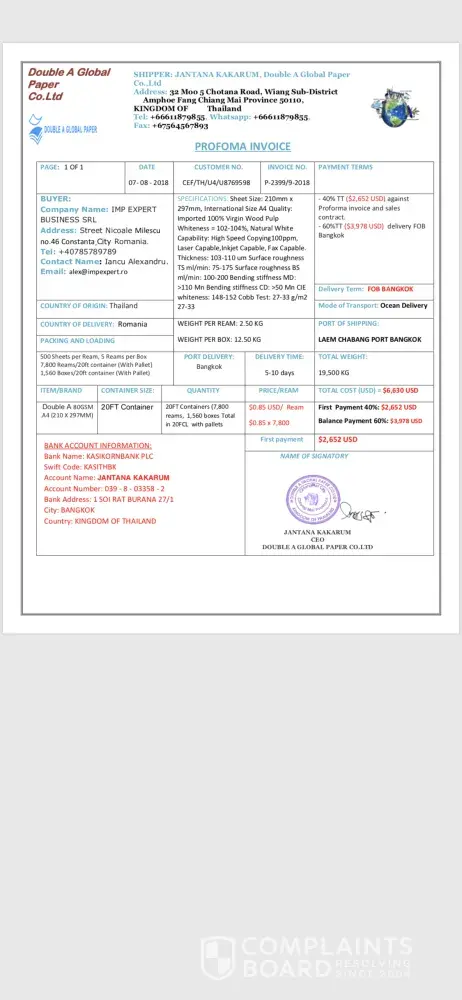 I ordered a 20-foot container for Double A A4 80gsm copier paper. I paid a sdash of 2600 usd, the remaining 3500 usd to pay for it when it arrives at the port in Bankok. I would like to know if this company is who claims to be before making the payment and for the remaining 60% of the contract. Double A Global Paper CO LTD. Address : 32 Moo 5 Chotana Road...