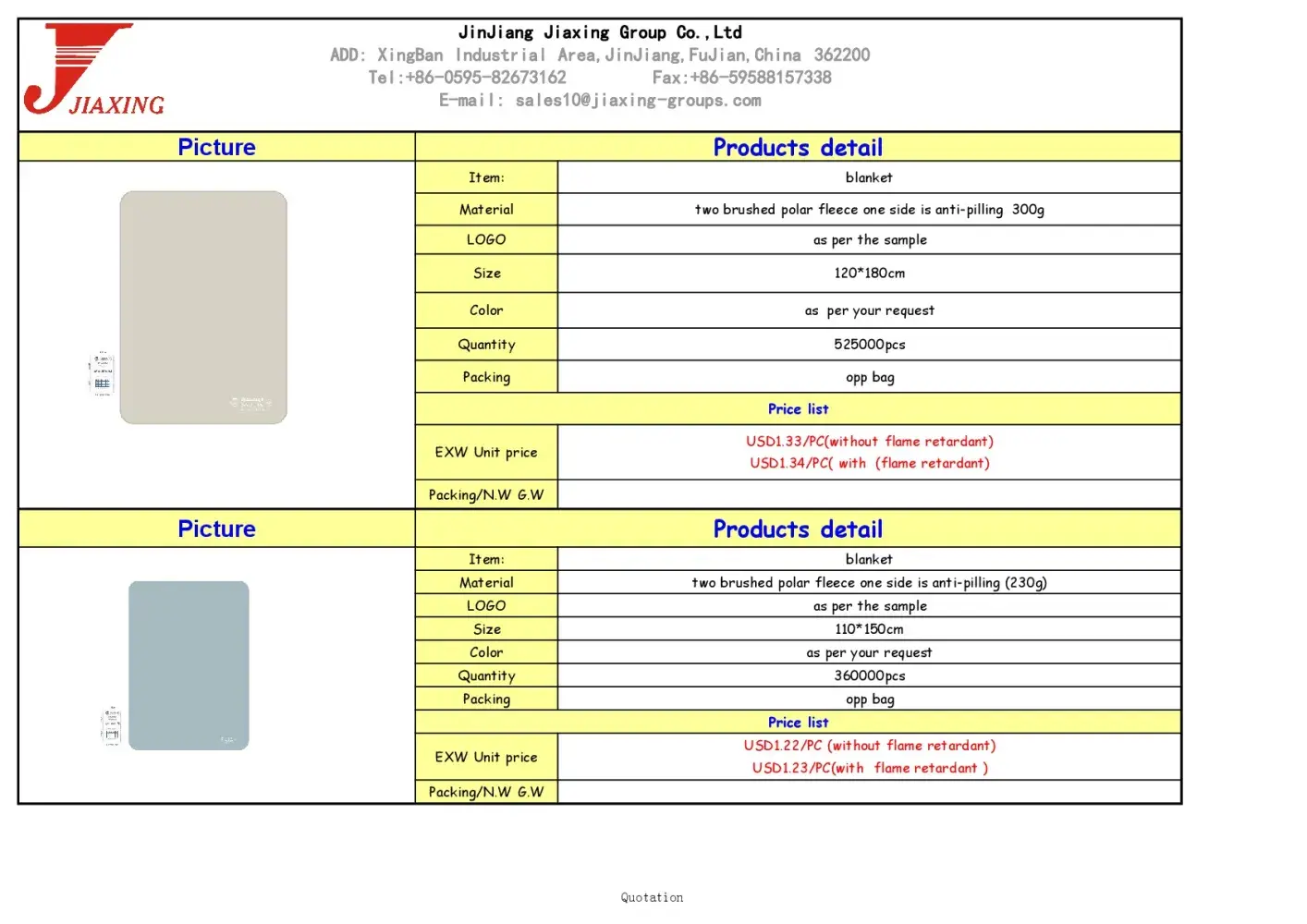 JinJiang Jiaxing Group Co., Limited, is really professional… in scamming people. Lily, her boss named Roy and her manager Holly were very professional in tricking us. At first, We had a quotation from this factory for producing blankets of two different size, we agreed on a FOB unit price for 0.93 $ and 0.92 $. When receiving the first quotation...