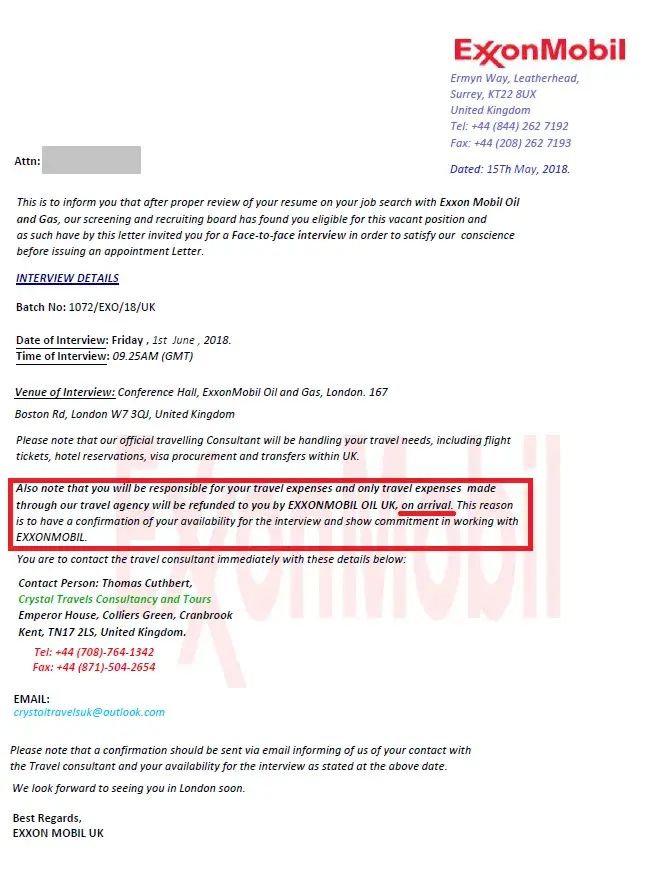 Read full complaintFake Job Offer on behalf of ExxonMobil Oil and Gas - Crystal travels consultancy and tours emperor house, colliers green, cranbrook kent, TN172LS uk - scam/fake job offer received on email, asking for travel to uk for interview