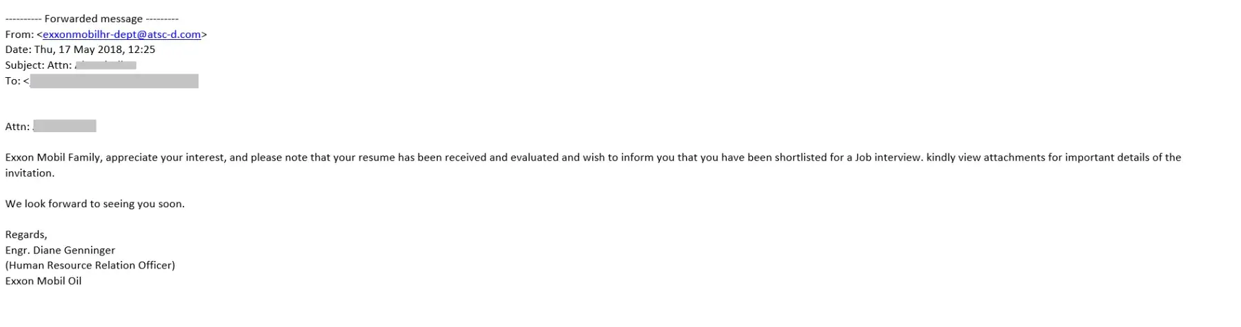 Hi, I'd like to report a scam for a Job Offer that I received today via e-mail. I'll give as many details as possible. Email coming from: [protected]@atsc-d.com (i checked the domain, it is a false one, with no content on their website. Also, nothing relates to the Exxon Mobile official emails) Subject: Attn: "my name" Body: see screenshot...