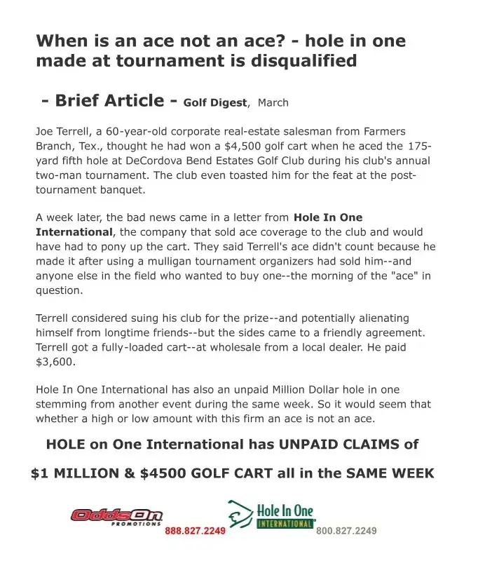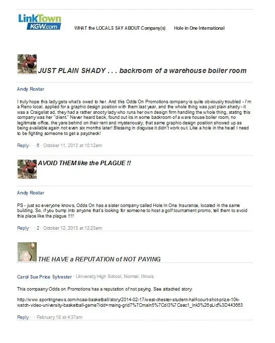 Hole in One Insurance Reviews Complaints. They are a scam organization I know I worked there. See what all of us local employees say about Hole in One International Odds on promotions is also their company. They have scammed us many employees as well as many clients out of an ungodly amount of money. See all the million dollar rip offs they have pulled on...
