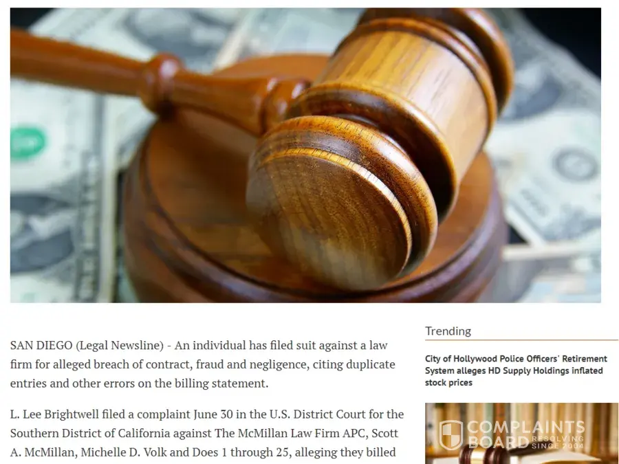 For most who thought of hiring Scott McMillan La Mesa Attorney, The_McMillan_Law_Firm, we all know he and former associate are sued for fraud in Brightwell v. Scott McMillan, Michelle Volk, The McMillan Law Firm (La Mesa) are sued in San Diego in San Diego federal court, Case No. 16-CV-01696-W-MDD . As recent as two weeks ago, the court refuses to dismiss the lawsuit. See press release, http://legalnewsline.com/stories/510992237-the-mcmillan-law-firm-allegedly-sent-inflated-bill-to-client