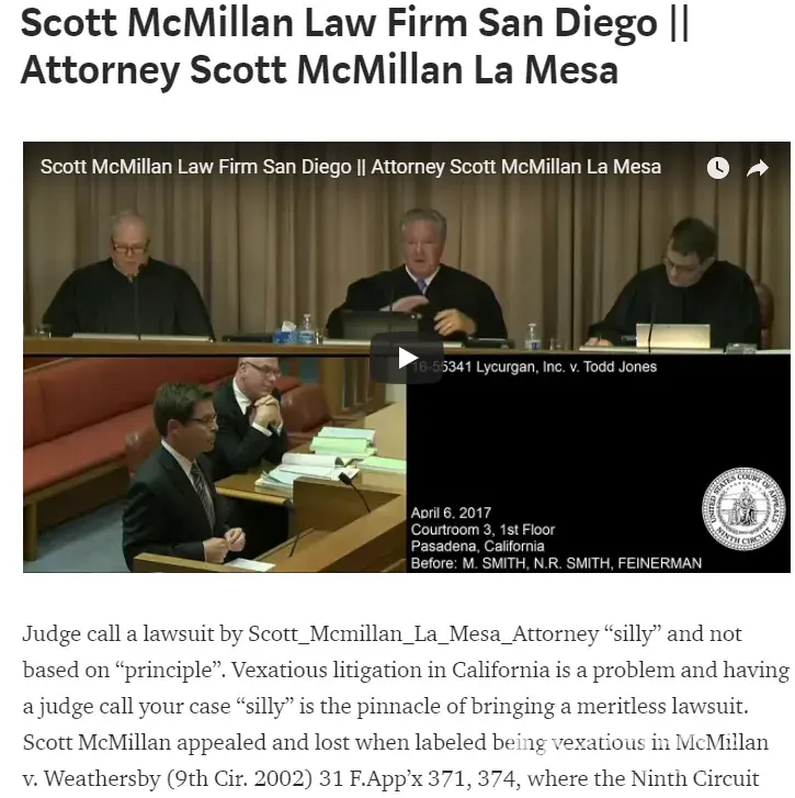 Additional information about San Diego attorney Scott McMillan losing to Muick Peeler law firm will be forthcoming as it deserves its own entry. Yes, it is seriously embarrassing The_McMillan_Law_Firm_La_Mesa lost that case too just a few weeks ago.