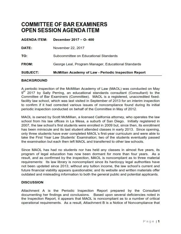 2018: State Bar of California shuts down McMillan Academy ofLaw [after finding it never had a single graduate, law books out of date by years, and only three students enrolled in twelve years]
