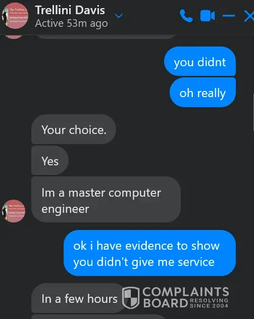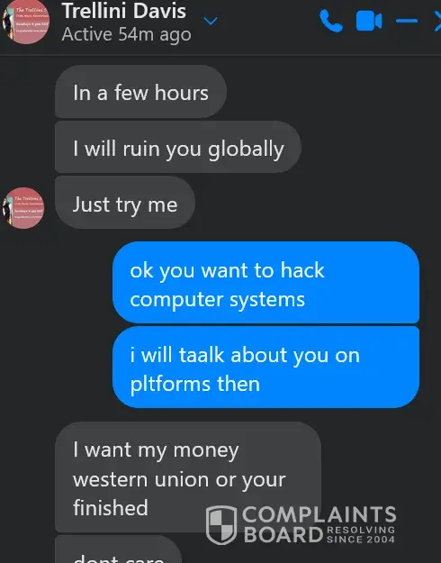 On Saturday February 26th, 2022, The owner of the above is threatening to ruin me on all social media because he wants me to pay for services I did not receive. He sent messages via facebook messenger after I changed my mind about using his services and requested a refund because I just had a strong feeling he was not legitimate after signing a contract digitally that I would pay for his services.
