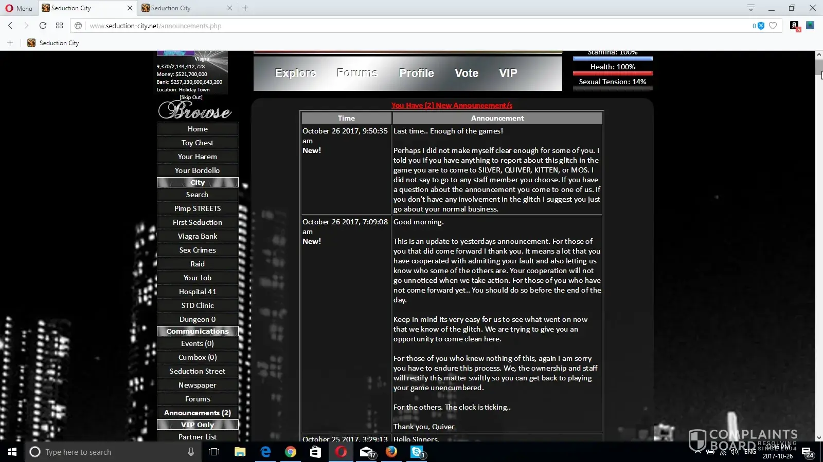 Who are you to dictate who can say what on this board lmfao- This is a public Complaint Board not governed by MoS you get no Brownie Points here lol. Actually if you even think about it because of this discussion Seduction City is rated #2 now here on this site! That is Free Advertisment and someone is bound to at least check it out. And for real seroiusly there are NEVER 300 online at the same time, maybe 50 at the most lol, that is 300 daily hahaha. However if he keeps pitting people, donaters sooner or later even all his flash sales ain't gonna keep it going :)