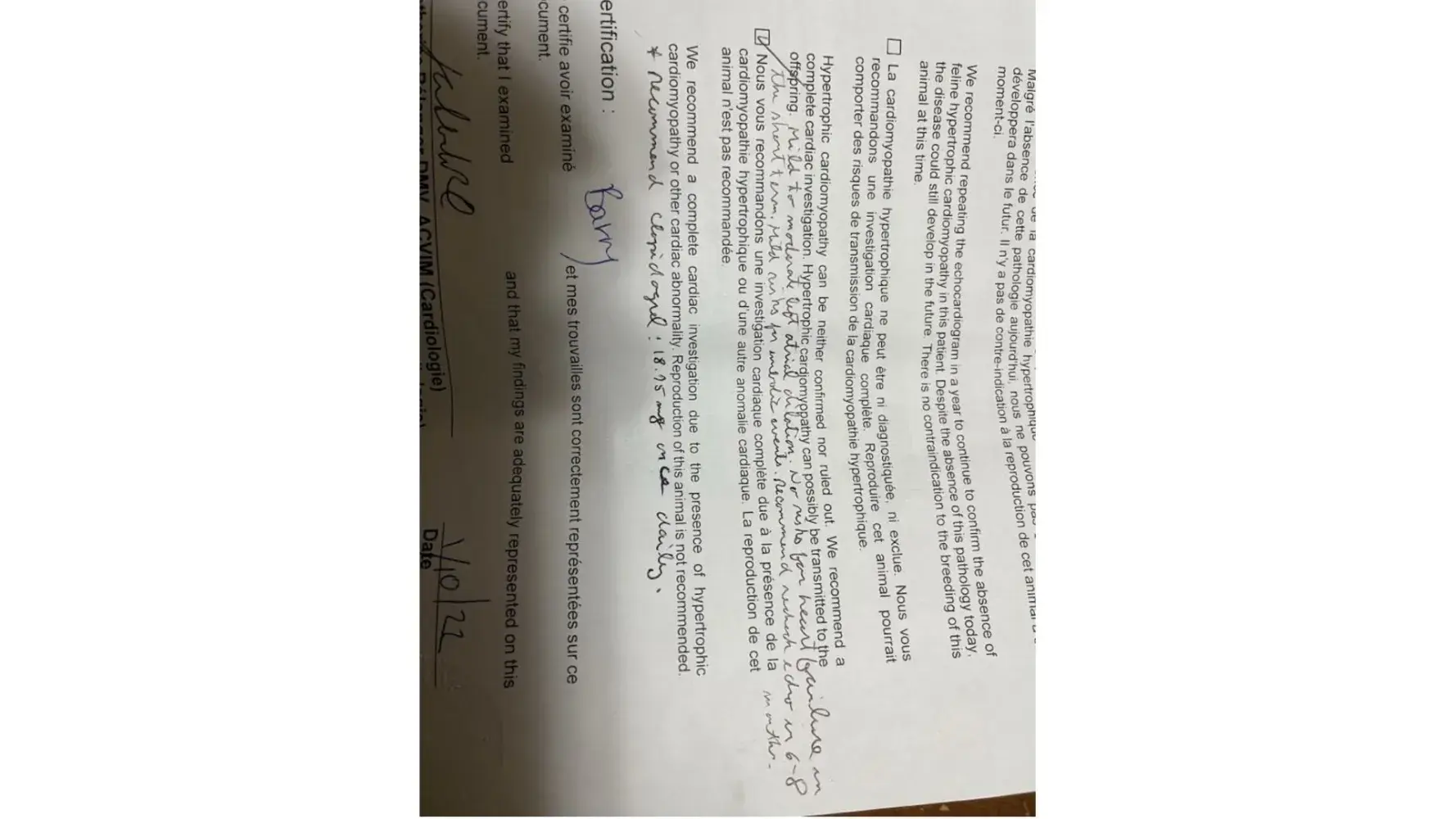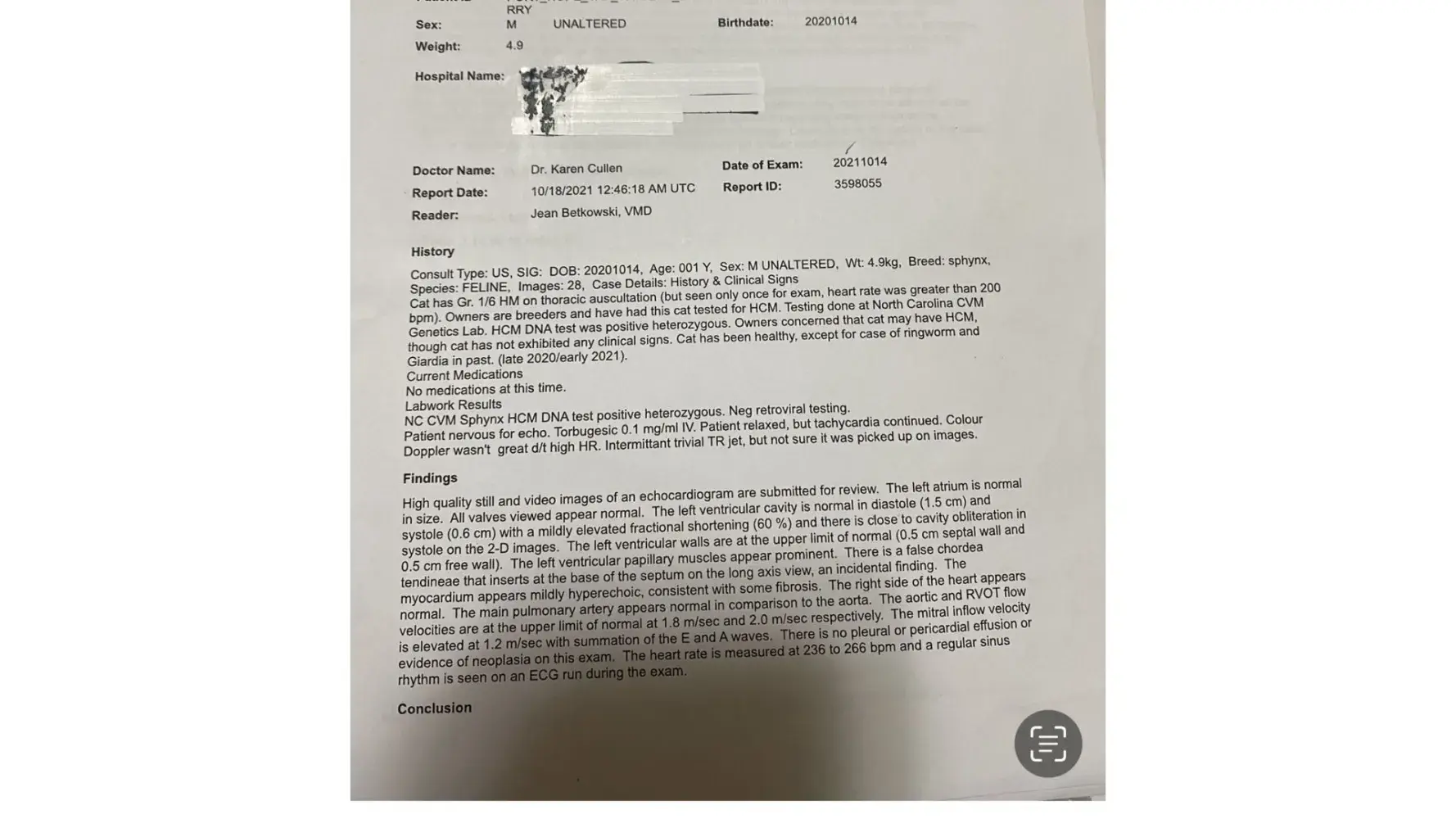 At a year we checked his heart via scan and found he was equivocal. We followed up that scan with a board certified cardiologist. She wanted another scan done so we rescanned a third time at the 6 month mark and he now has HCM.