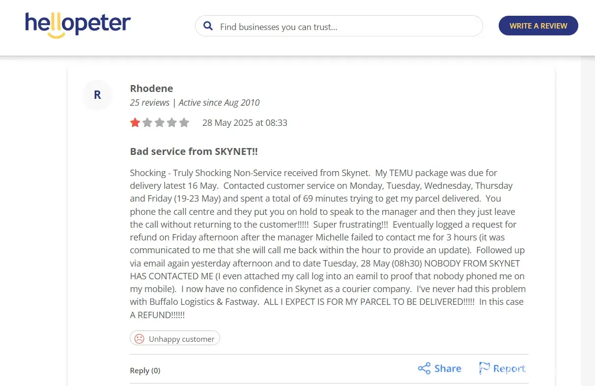 Yesterday I tried to phone your company skynet in order to find out if they will deliver my parcel that I am waiting for but they phone was just ringing and if someone pick the phone up he or she would put the phone back on the hook. It's not the first time I experience such service from skynet. One time I had to call skynet to find out about my parcel as it was 16:00 in the afternoon already and my parcel wasn't delivered as I received a message the morning that says my parcel would be delivered.. And when they eventually come with the parcel the person told me that they ride with people's parcels from Uitenhage for days so the customer must just wait for they parcel. I sell avon and that's my income that you're company is playing with