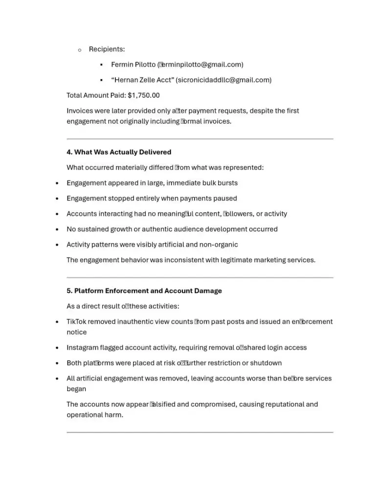 I am reporting an international service fraud involving misrepresented social media marketing services. I hired an individual and associated parties operating under the names Hernán Frangi, Marc Hall, and Sicronicidad LLC to provide professional social media marketing services for my business. The services were marketed as legitimate, organic engagement...