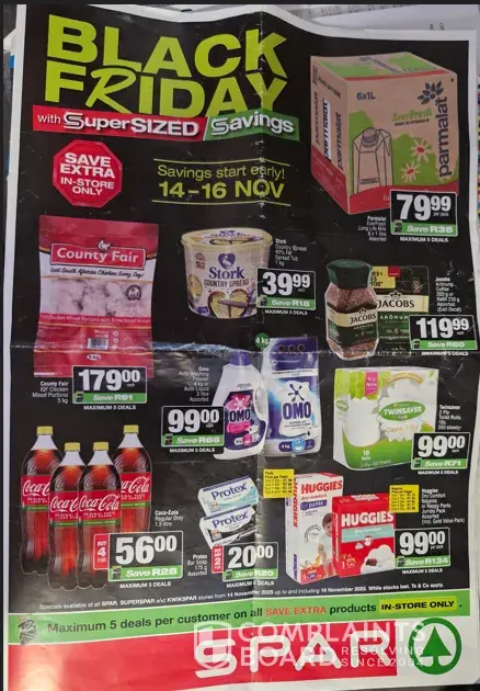 Good afternoon I am writing as a highly disgruntled and disappointed customer of SPAR. The Black Friday Supersized Savings pamphlet, which I received in my post box on Thursday, 13 November 2025, clearly advertises various savings deals valid from 14–16 November 2025. This implies that the advertised items would be available on the shelves from opening...